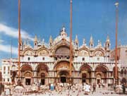 二、中期:(7-12世纪),由于外敌相继入侵,国土缩小,建筑减少,规模也大不如前。其特点是占地少而向高发展,中央大穹隆没有了,改为几个小穹隆群,并着重于装饰,如威尼斯的圣马可教堂。