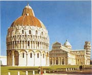 比萨主教堂,它的钟塔和洗礼堂,是意大利中世纪最重要的建筑群之一。它是为纪念1062年打败阿拉伯人,攻占巴勒摩而造的。