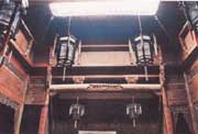 前厅上方的拱棚上,还有国内罕见的“倒立双狮戏球”式木雕棚托,厅堂两侧卧室的厢房上,雕有“福、禄、寿、喜”四位神灵,和各带一名道童的“八仙”。