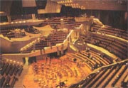 柏林爱乐音乐厅的前厅安置在观众厅的正下面,由于观众厅的底面如同一个大锅底,其下的前厅的空间高矮不一,其中还布置着许多柱子、杰梯和进口,因而这个音乐厅的前厅的空间形状极其复杂,路线非常曲折。初次来此的人会产生扑朔迷离、摸不清门路而丰富诱人的印象。及至进入观众厅内,看到的又是如同山口袋中葡萄园似的景象。听众席化整为零,分为一小块一小块的“哇田”似的小区,它们用矮墙分开,高低错落,方向不一,但都朝向位于大厅中间的演奏区。由于化整为零,一般大观众厅中常有的诚大的大尺度被化解了,确实呈现出亲切]随和、轻松、细开展巧、潇洒的气氛。