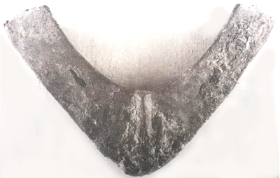 河南辉县固围村出土。铁犁铧冠多呈V字形,宽度一般超过20厘米,套在三角形犁铧上使用,便于磨损后及时更换。
