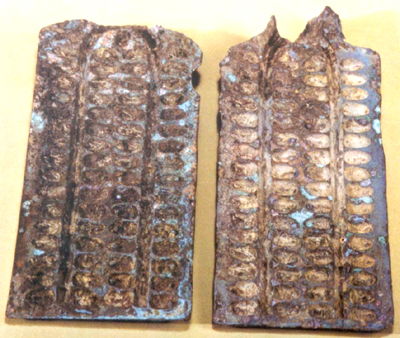 安徽繁昌出土。战国。两件,浇铸口皆残。两范的形制相似,长方形,薄边,浇铸口为长条形,在一端。背中心铸造一长方形钮。正面阴刻贝型和浇铸槽。贝型排列四行,作对称式,每行十六枚凹贝型,文为“”字。正面计两条浇铸铜液的沟槽,于铸口汇合为一沟槽,右范在四行贝型前端中心又单置一枚贝型。贝币背部隆起,并有铸文,底平,无文,面涩,以示铜贝币范只需用一面,平放在砂面上,即可进行浇铸铜液。