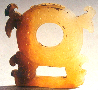 河南淮阳平粮台出土。战国。玉料呈茶色,半透明。质地细润。下部为相背伏卧的连尾双兽,其上雕琢正圆形的小形玉璧,两侧各雕相向的立鸟,鸟冠、喙、羽尾皆清晰可见。双兽首承玉璧,且有上扬的飞翼。因双兽的连尾处钻有一穿,可以推知它不是“鼓形佩”,而应是铆钉于其它器物上的装饰品。