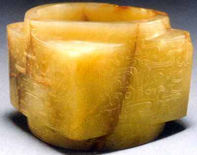 湖北随州擂鼓墩出土。战国早期。玉料呈青色,有褐色浸斑,半透明,有光泽。内圆外方,两端作圆环形,中间有两端对钻的大圆孔。器表四面各刻一个狰狞的兽面纹,纹样大同小异,皆以阴线琢出。玉琮两端口沿阴线雕弦纹一周。