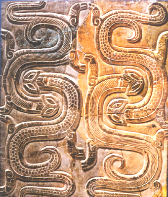 河北平山出土。战国晚期。黑灰色的墨玉,不透明。扁平体,长方形。四龙纹作左右对称蟠绕的形象。龙纹皆系隐起雕刻。左侧两龙,分居上下,龙首相向,交叉于龙身屈曲的空间。龙首扁圆,雕出双目,额头布短密的阴线纹。龙身边缘刻线较粗。前后足附于躯体两旁,足饰可见利爪。龙尾分别向上勾卷。龙身再雕琢小龙,饰陶索纹和鳞甲纹。玉板右侧两龙的构图与左侧相同,但龙身的纹饰相反。此玉板上的龙纹设计颇具匠心,在没有增加画面空间的情况下,龙的数量增加一倍,给人以新颖奇巧之感。