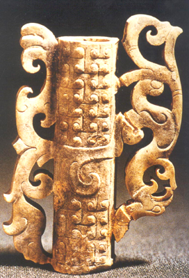 安徽长丰杨公出土。战国晚期。玉料呈黄色,质地细润,表面有光泽。主体呈圆筒状,中空,外壁中段雕琢有突起的宽弦纹和勾云纹,其上下的管壁雕阴线勾连卧蚕纹。管的一侧雕镂凤鸟一。若将此器倒置,可见这只凤鸟为立姿。凤首高冠与器壁相连接,凤鸟圆眼张喙、曲颈,头向右下回旋。凤身卷曲,足爪与器壁连接。长尾修翎,向右上方旋转。管壁另一侧雕镂卷草式凤尾,呈多曲状附于器身。此器多镂空,造型生动、美观,惜顶端一侧稍残。