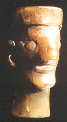 河南光山黄君孟墓出土。春秋。黄褐色。圆雕。人首作椭圆形,成正视图像。头戴两端下垂的软帽,臣字形眼,高鼻梁,口微张,双耳佩环。筒形长颈。头顶至颈的中心有一直孔,可穿系佩饰。