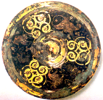 河南洛阳金村出土。战国中晚期。镜背错金银。钮座圆形,周围有三处云纹,间以骑士斗兽图案。镜面用含鍚量高的白色青铜制成,与镜背成分不同,是珍贵的复合镜,花纹也极细腻美观。