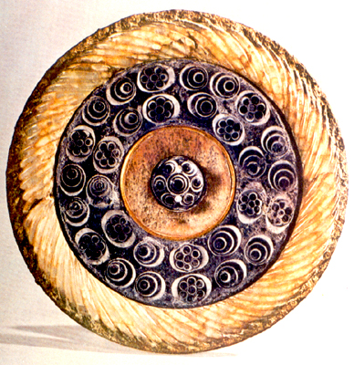 河南洛阳金村出土。战国中晚期。无钮,代以圆形蓝色琉璃,上有白色回形花纹。其外套以玉环,作为钮座。周围嵌蓝色琉璃,有白色目形或六出花形纹饰。外缘为索纹玉环。此镜装饰独特,镜面已覆重锈,或以为不是铜镜而是某种饰件,有待进一步研究。