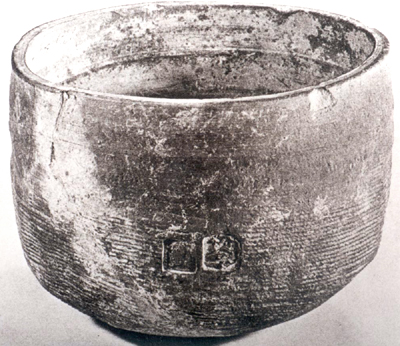 山东临淄出土。战国。高17、口径20.5厘米,容4847毫升。广口,深腹。腹部有绳纹,壁上有戳印铭文两处。一处阳文“公区”,另一处阴文“里人”。器形和印文与公豆陶量相似。据《左传·昭公三年》记载,齐国容量单位有豆、区、釜、锺。公豆、公区大概是齐国通用的量器。