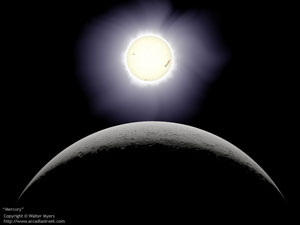 美国发射的行星探测器“水手”10号与1974年3月29日、9月21日和1975年3月16日三次经过水星,探测到水星的表面很象月球,布满了大大小小的环形山。此外,还有平原、裂谷、盆地等地形。其中有个中心位于北纬30°、西经195°,半径达1,300公里的卡路里盆地,是太阳系诸行星中表面温度最高的地方。水星上的大气含有氦、氢、氧、碳、氩、氖、氙等元素,但极其稀薄,因此昼夜温差很大,白天太阳光直射处温度达到700K,夜晚冷到100K。