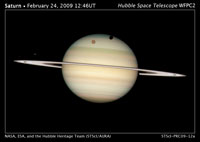 土星光环是一系列的同心圆,从外向里除了A、B、C环外,还有F环、G环、一条恩克环缝等。光环的平面在土星赤道面内,与土星的轨道平面成 26°44′的倾角,而且光环平面在绕日运动中方向不变,所以在地面上观察光环有时窄些,有时宽些。里边的光环转的快,外环转的慢。光环与光环之间接触的部分由于摩擦和碰撞生热,使之接触部分融化,然而在低温环境下,马上又凝固在一起,犹如滚雪球一样越聚越大,可以形成直径数十公里的小卫星。事实上确实有的小卫星在光环的边缘与环一起绕土星运转。