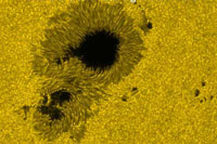 太阳黑子,也叫日斑。它发生在太阳的光球层上,是太阳中最基本、最明显的活动现象。一般认为,太阳黑子实际上是太阳表面一种炽热气体的巨大漩涡,温度大约为4500K。因为比太阳的光球层表面温度要低,所以看上去像一些深暗色的斑点。太阳黑子很少单独活动,常常成群出现。