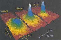 囚禁冷却的原子和“原子激光” 绝对零度(10nK)附近囚禁原子,原子的热运动十分弱。在磁场中,同时在三个方向上用激光照射被冷却的原子,原子将停留在激光的电场波动的谷内。实验上已经可将成千上万个原子囚禁在一个很小的范围内。有趣的是所有的原子还具有同样的动量。发射出来,一束原子具有与激光一样的性质,即空间和时间的相干性。人们在思考如何利用这一束原子“激光”。初步认为在通信和物质探索上会有重要的应用。 实验装置和实验情形,图中的 黄点是被囚禁的钠原子云。它的 温度为绝对温度的百万分之一。 被激光囚禁的铷原子云。表 面温度越低,被囚禁的铷原子 云的尺寸越小,更多的铷原子 云处在同一的量子态。 [上一页] [下一页]