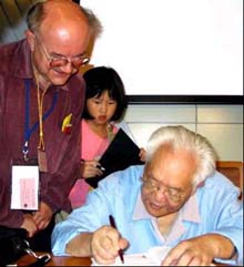 在作完报告之后,吴文俊教授在为外国数学家和中国听众签字留念。