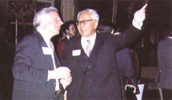 1979年华罗庚与著名数学家庞比尼在国际数论会议上相会。 |