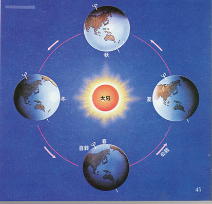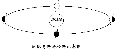 由于地球自转轴与公转轨道平面斜交成约66°33′的倾角,因此,在地球绕太阳公转的一年中,有时地球北半球倾向太阳,有时南半球倾向太阳(左图)。总之太阳的直射点总是在南北回归线之间移动,于是产生了昼夜长短的变化和四季的交替。