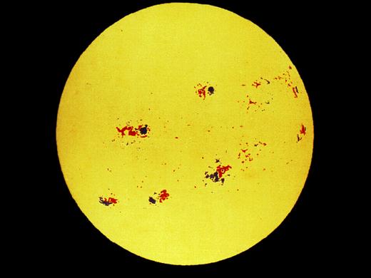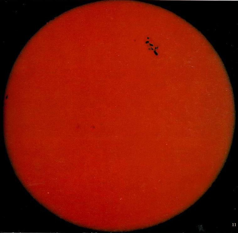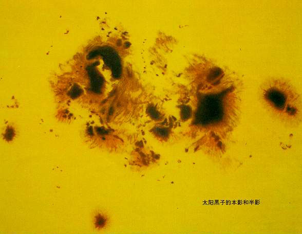 发展完全的黑子是由较暗的核(本影)和围绕它的较亮部分(半影)构成的,形状像一个浅碟。太阳黑子是太阳活动的最明显标志之一。太阳黑子的突出特点是具有强大的磁场,范围从小太阳黑子的500高斯到大太阳黑子的4000高斯不等。黑子最多的年份称太阳活动极大年,最少的年份称太阳活动极小年。太阳黑子的平均活动周期是11.2年。光球上还有一些比周围更明亮的区域,叫光斑。它与黑子常常相伴而生。