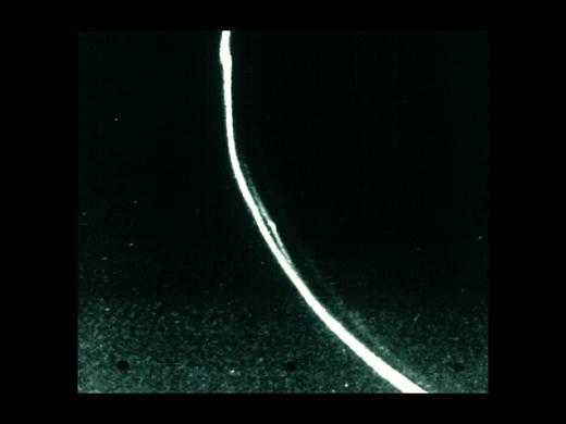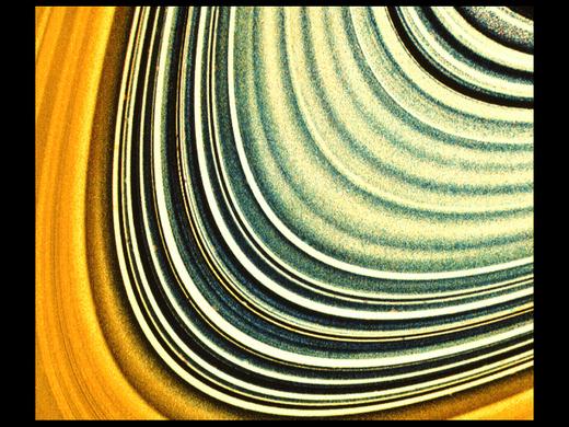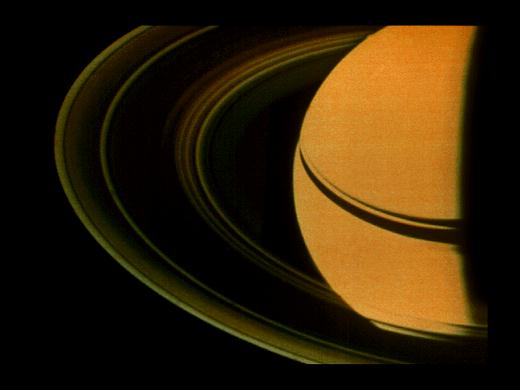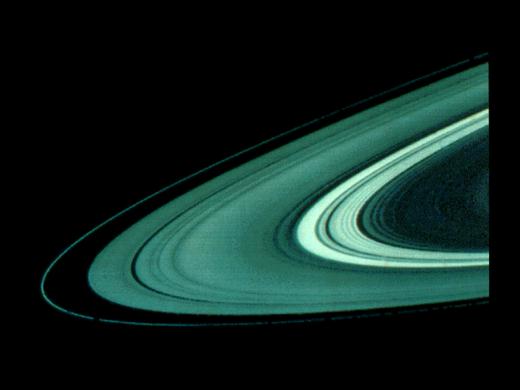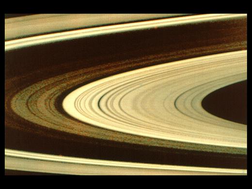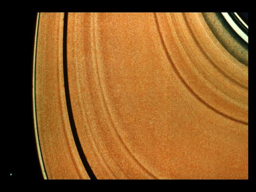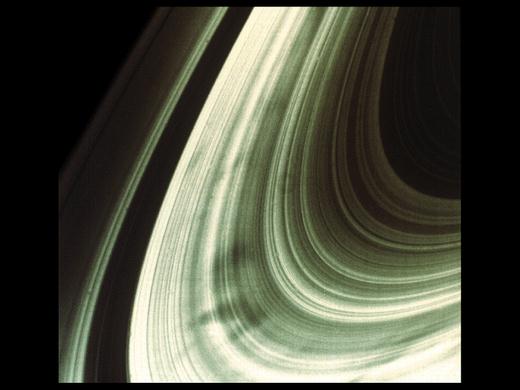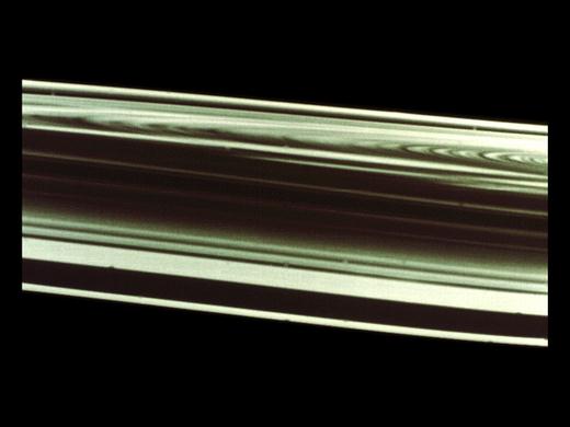 “旅行者1号和2号”探测器把土星环的近距离照片送回后,科学家们非常吃惊:原来每一层又可细分成上千条大大小小的小环,即使被认为空无一物的卡西尼缝也存在几条小环。在照片中可见到F环有5条小环相互缠绕在一起。土星环的整体形状类似一张巨大的密纹唱片,从土星的云顶一直延伸到32万千米远的地方。