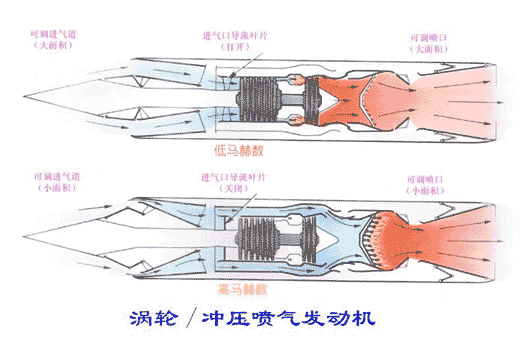 这种发动机压缩空气的方法,是靠飞行器高速飞行时的相对气流进入发动机进气道中减速,将动能转变成压力能(例如进气速度为3倍音速时,理论上可使空气压力提高37倍)。冲压发动机的工作时,高速气流迎面向发动机吹来,在进气道内扩张减速,气压和温度升高后进入燃烧室与燃油(一般为煤油)混合燃烧,将温度提高到2000一2200℃甚至更高,高温燃气随后经推进喷管膨胀加速,由喷口高速排出而产生推力。冲压发动机的推力与进气速度有关,如进气速度为3倍音速时,在地面产生的静推力可以超过2OO千牛。