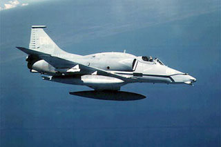 A-4“空中之鹰”(Skyhawk ,也译作“天鹰”)是美国原麦克唐纳.道格拉斯公司(现已经并入波音公司)研制的单座单发轻型舰载攻击机。A-4的第一架原型机于1954年6月首次试飞成功,同年10月正式装备部队,1979年停止生产。