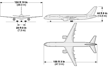 尺寸数据:翼展38.05米,机长47.32米,机高13.56米,机翼面积185.25平方米,1/4弦线后掠角25°,客舱36.09米×3.53米×2.13米。