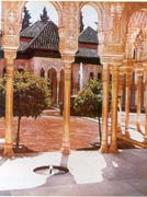 西班牙格兰纳达的阿尔罕布拉宫,是伊斯兰世界中保存得比较好的一所宫殿。它位于一个地势险要的小山上,有一圈3500米长的红石围墙蜿蜒于浓荫之中,沿墙耸立着高高低低的方塔。围墙的大门叫公正门,在南边,君主在这里审理诉讼。宫殿偏于北面,它以两个互相垂直的长方形院子为中心,南北向的叫石榴院,以朝觐仪式为主,比较肃穆。东西向的叫狮子院,比较奢华,是后妃们住的地方。