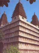 五塔是在由须弥座和五层佛龛组成的矩形平面高台上,再建五座密檐方塔。台座南面开一高大圆拱门,由此可循梯登台,台上中央的密檐塔较高,十三层;四角的较小,十一层。