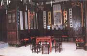 正对中门的前厅横梁上,雕有一幅“宴官图”,展示一群京城高官显贵,在花园中宴酒作乐的情景;“宴官图”两边的额坊上,雕了“元宝”与“金钩钓鱼”图;中门上方阁楼护板上,有“渔、樵、耕、读”四根木雕立柱,下面是“南北财神”,再稍下,四块斗拱上雕了四出《三国演义戏文》;中门上方面临厅堂的正中处雕有“百子闹元霄”图。别出心裁的是,中门两侧的边门上方,雕了两个“商”字形图案,从边门出入的人,都必须从“商”字下边走过。