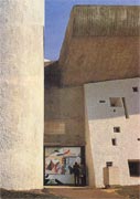 在朗香教堂的设计中,勒.柯布西耶的创作风格脱离了理性主义,转到了浪漫主义和神秘主义。