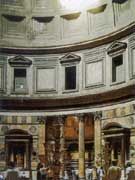 早期的万神庙也是前柱廊式的,但焚毁之后,重建时,采用了穹顶覆盖的集中式型制。新万神庙是圆形的,穹顶直径达43.3米。顶端高度也是43.3米。按照当时的观念,穹顶象征天宇。它中央开一个直径8.9米的圆洞,象征着神和人的世界的联系,有一种宗教的宁谧气息。