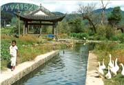 穿过一片稻田,在蛙声中跨过石桥就到了腾冲的和顺乡。这是云南最具古典风格的乡村, 完整保存着明清以前的许多建筑和民风民俗。乡村道路旁屹立着供人避雨的灰色的风雨亭;潺潺溪流和睡莲间的具有明代风格的洗衣亭,依然有少妇在水边的厚木板上捣衣洗菜;大白鹅像唐诗描写的那样在龙潭里悠游;百年前创造的画栋、雕梁、家具、牌坊、文庙、匾额完好如初,虽被风雨褪尽色彩,却更加赏心悦目。每一栋楼房都象一件精美绝伦的艺术品,推开门,总会有人热情的招呼你进去坐,一杯清茶,主人幽幽道出祖先的故事,定会让你有了桃花源中恍如隔世的感觉……