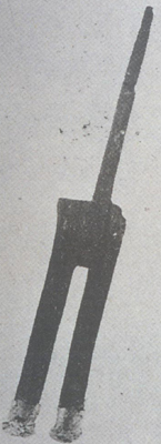 这是一件发现于湖北江陵纪南城水井中的战国木耒(lěi),其双齿套有铁刃。耒是下端双齿的挖土工具,直至汉代仍延续使用。