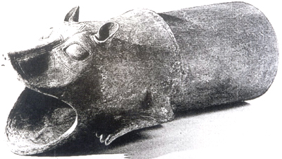 河北易县燕下都出土。战国。泥质灰色,胎质坚硬。管道前端作虎头形,立耳瞪目,口部大张,部分前躯与头部相连,两腿平伸,足各四爪。后端作子口,稍细,以便套接。此水道管是燕国都城建筑物下水道的排水口。