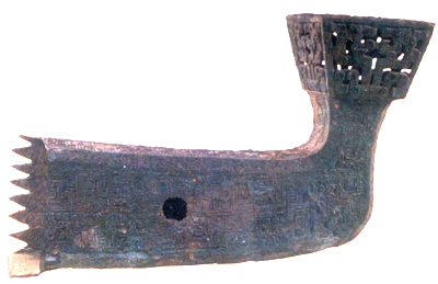 江苏沙洲鹿苑出土。战国早期。斗拱后端有齿。身饰蟠螭纹,有圆形钉孔。前端作方斗形,饰镂空蟠螭纹。铜质斗拱仅此一见,甚为珍异。