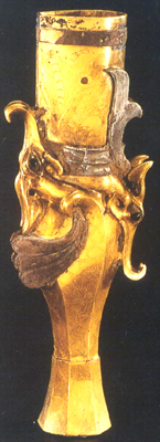 河北平山出土。战国中期。酒器。鐏呈八棱形,两侧为相向的两龙,以蓝琉璃镶睛。向上一龙银镶双翼,向下一龙银镶双角。造型华丽,针刺花纹细如毫发。