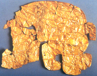 河南新郑出土。春秋。兽首形,张口怒目,颈间系水波纹带,头后边缘凿二圆孔,嘴下颌边缘亦有两孔,通体蟠螭纹。此饰件包镶于铜兽首之上,背面残留铜片三小块。以锤打方法压成形。