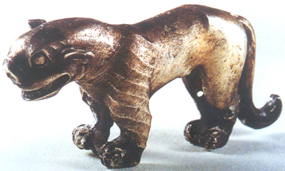 陕西神木纳林高兔出土。战国。方鼻圆头,环眼,两耳外撇,张口暴齿,臀部耸起,立前视,呈现出一种咆哮的神态,颈短粗,躯体浑圆而中空,四肢粗壮,下趾发达,长尾垂地上卷。双肩及前肢隐起的斜条纹和尾鼻的凹弦纹装饰,突出表现形体的结构,增加了质感的效果。