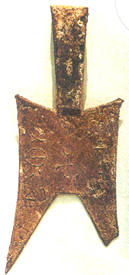 耸肩尖足布,这种空首布较为少见,均为细长銎,耸肩,尖足,背亦有三道平行竖纹。铭文五字,前三字不易辨识,后两字为“黄