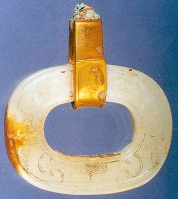 河南淮阳平粮台出土。战国。玉料呈淡青色,有棕黄色斑浸。半透明,有光泽。扁平体,椭圆形。玉环内外边缘雕琢阴周线,两面皆琢双阴线勾云纹。金柄剖面呈长方形,套扣于玉环首的一侧。金柄向外伸延的一端可见残断的铜削遗迹。据此可以推知此器应是铜削的金柄玉质环首。
