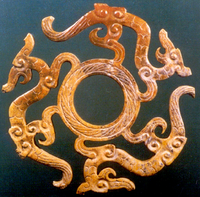 河北平山出土。战国中晚期。玉料呈黄褐色,半透明。体扁圆,镂雕而成。两面纹饰相同。中央一环,内外边缘雕琢突弦纹轮廓周线。环的表面刻细密陶索纹。环外雕镂三条姿态相同的龙,皆作顺时针方向爬行状。龙独角,圆眼,回首,张口,曲身翘尾,前后足作卷曲状。躯体表面雕琢鳞甲纹和云纹。此环制作工艺难度颇大,雕镂琢磨极精,堪称战国玉器之绝品。