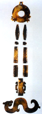 山东曲阜鲁国故城出土。战国。青黄色。由璧、珠、管、夔龙等十一件组成。璧上有方孔,下有双龙形耳。枣核形玉管一对。珠一对,呈方形,有穿孔。圆柱形管两对。扁圆形管一件,两侧有夔龙耳。夔龙一件,回首,弯身,卷尾,头顶有角,身有圆孔。各件皆饰谷纹。以绳穿连,为一组完整的佩饰。