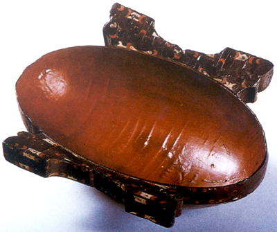 湖北江陵望山出土。战国中晚期。此杯的平面呈椭圆形,弧形壁、平底,口沿外有对称的凹字形耳。杯为厚木胎,以挖制为主的方法制成。杯内髹朱漆,杯外髹黑漆。在黑漆地上用朱漆描绘花纹,两耳上与口沿外绘勾连云纹,两耳外侧为圆卷纹。