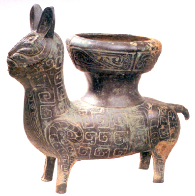 河南三门峡上村岭出土。春秋早期。尊体作小牛形,耳上竖,无角。躯体饰云纹,面部及耳内饰鳞纹,胸前饰斜角云纹,足上部有卷曲的云纹带。牛背有外形似豆的尊口,口沿下环以斜角螭纹一周。器出自虢墓。西虢原封在今陕西宝鸡,西虢覆灭后随王东迁至此。此尊继承西周动物形尊传统,但造型已有所不同。