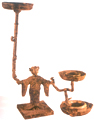 ,有鼎、豆、壶、盘、尊等,乐器有编钟,生活用具有带勾和镜等。从各地出土的铜器及山西侯马铸铜遗址出土的陶范考察,当时除采用浑铸法外,已广泛采用分铸技术,即将器物的耳、足、环等附件铸好之后,嵌在主体范中,然后灌注铜液,让器身和附件熔铸在一起。也有先将主体和附件分别铸好,然后再用合金焊接。春秋中期以后,还出现失蜡法溶模铸造技术,如河南淅川下寺楚墓出土的铜禁、湖北随县曾侯乙墓出土的铜尊盘等,上下多层花纹皆纤细透空,即以这种技法铸成。但一般工具和兵器仍用合范铸造,而且一范多用。铜器花纹的制作已采用花版捺印的新技术,其它如镶嵌、鎏金、金银错、细线雕等新工艺,使东周铜器的装饰花纹富丽堂皇。