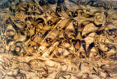 湖北江陵马山出土。见于蟠龙飞凤纹绣浅黄绢面衾衾面。单元图案为长方形。乡地为浅黄色绢,绘墨稿。绣线可见棕、深红、土黄、浅黄色。图案上部是一条作反S形盘旋状的大龙口衔一条小龙的尾部,小龙作S形,与大龙回首相顾。图案的下部是一只高冠、展翅而飞的凤鸟,嘴部与图案上部大龙的尾部相衔。凤鸟下部是一条卷曲的小龙。中间有花枝和十字形作为对称轴。除凤冠、凤翅用稀疏的单行锁绣线填充外,其它部件均为满绣。图案构思紧凑、充实,绣线颜色配置协调,给人以华丽之感。