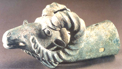 内蒙古准格尔旗玉隆太出土。战国晚期。羊双角向前盘卷,双目前视,口微张,额下有长鬚。颈向后伸延成圆形銎,銎侧有两个钉孔,銎下侧有磨痕。铸造精致,形象生动逼真。