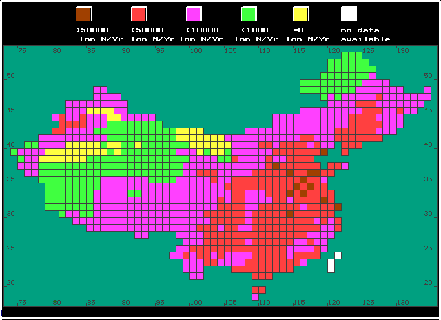1¡ãÍø¸ñÅÅ·Åͼ¡£ÓÐȤµØÊÇ£¬¸ÃͼÓëÇ°ÃæµÄSOxºÍNOxͼ¹æÂÉÓÐËù²»Í¬£ºÅ©´åNH3µÄÅŷŸßÓÚijЩ³ÇÊУ»Î÷²¿Å©ÄÁÇøNH3µÄÅÅ·Å£¬²¢²»±È¶«Äϲ¿µÍ¶àÉÙ¡£
