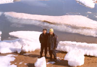 前次没有能去西岛,我和小李仍不甘心。尤其是小李,一个学地质的,总想去探索一点秘密。上午,我和小李再次探索去西岛。要去西岛,必须先穿过一个小海峡,日本队员叫做“channel”。事实上,这条海峡只约50米宽,冬天冰雪封冻,可以从冰面上走过去。但现值夏季,冰雪消融,无法走过去。日本队员自制了一个小缆车,作为去西岛的交通工具。现在不巧出了故障,不能用。我和小李虽多次努力,仍无法修复缆车,只好望峡兴叹。我们在那儿逗留了一个多小时,拾了一些南极石,拍了些照片,正要离去,偶遇荒木飞行长,合影留念后,返回。