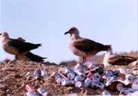 海豹不再出现了。一群南极鸥正贪婪地吃着队员们剩余的食品,我想拍海鸥觅食的特写镜头,尽量靠近它们。海鸥被我惊动,飞走了,很快又飞回来,食品的引诱力太大了。我只顾拍特写,不料却惊动了海鸥。有几只海鸥飞起来,居高临下,向我扑来,俯冲中还向我投射"炸弹"。我躲开"炸弹",用镜头对迎着它们的俯冲,"咔嚓""咔嚓"地还击。一场"战斗"结束了,我开始"撤退"。有几支海鸥还尾追了一阵才返回。